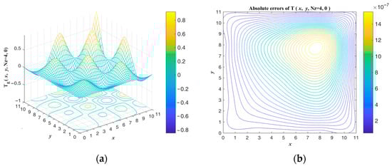 The considered domain is given by . Here, the spatial discrete numbers in the and directions, time discrete numbers, fictitious time size, convergence speed, and final time are set as follows: , Then, given an initial guess value, , , . When the boundary temperature is not considered as zero, the boundary conditions have the same ratio , where 0.367879441171442. Considering the same convergence criterion in this example, let the whole domain . The proposed scheme converges within one iteration. The result satisfies the solution of the two-point boundary value from the LGSM [] and converges within one step. The exact solution and numerical absolute errors of the present scheme are shown in Figure 3. The maximum numerical error is smaller than .