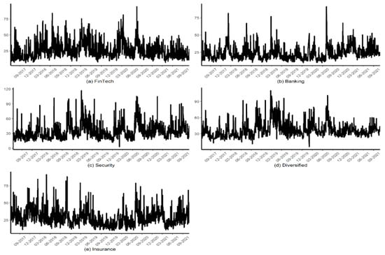 Volatility dynamics of (a) FinTech, (b) Banking, (c) Security, (d) Diversified, and (e) Insurance indices from 9 June 2017 to 30 October 2021.