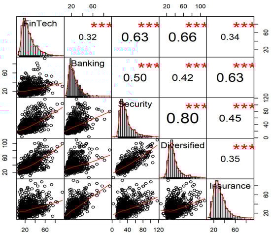 Plot of distribution and pairwise correlation among FinTech, Banking, Security, Diversified, and Insurance indices. The circles present the data of volatility, and the red lines nearby are fitted with the data. The red lines in the histograms show the Kernel density estimation. Symbol *** denotes the significance at 1% level.