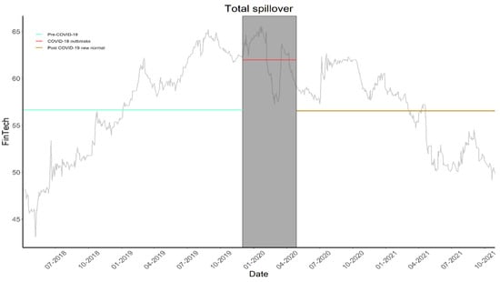The role of economic fundamental determinants in explaining spillover can be described as follows. First, the rapid development of information technology not only accelerated the progress of FinTech, but also tightened the ties of economic and financial markets around the world and enhanced their interdependence, resulting in economic globalization and financial integration, which possibly promoted the connectedness between FinTech and traditional financial industry. Second, according to the Theory of Economic Man [60] and Portfolio Theory [61], the business cycle and exogenous shocks can affect investors’ belief in uncertainty and risk aversion, which will finally affect stock volatility. To be more specific, when an economy is in deep recession, companies will face higher risks of profit decline or even loss. The stock index may fall sharply and under the influence of investors’ pessimism, the volatility spillover between stock markets may increase. Corradi, et al. (2013) [62] and Engle, et al. (2013) [63] found that stock volatility is largely dependent on the macroeconomic determinants. The effects of the business cycle and exogenous shocks can even propagate across sectors. When uncertainty increases, investors may rebalance their portfolios by increasing exposures to low-risk traditional financial sectors and decreasing the holdings of high-risk FinTech stocks. Furthermore, major political [64,65], financial [66], and natural events [17,67,68] are found to increase volatility in the stock market and FinTech market, probably resulting in volatility spillover between the two markets.