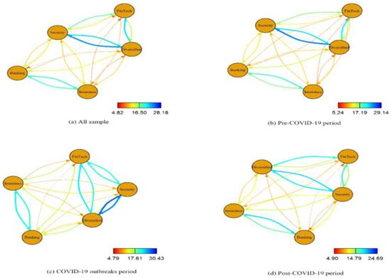 Figure 5 shows four subplots, indicating the DSI in the whole sample, pre-, outbreaking, and post-COVID-19 period, respectively. It can be inferred from Figure 5 that the directional spillover index between FinTech and traditional financial subsectors approximately ranges from 4% to 28%. The spillover between the security industry and diversified financials achieves the highest level and FinTech has a close connection with the security industry and diversified financials. However, the connectedness between FinTech and banking and insurance is relatively low. A clear time-varying pattern is observed after we divide the period according to the situation of the COVID-19 pandemic. Concretely, a comparatively high DSI is witnessed during the outbreak of COVID-19 as shown in Figure 5c. This result is consistent with TSI illustrated in Figure 4 and can be explained by the huge shock of the pandemic on the economy and investors’ panic. The DSI patterns in the pre- and post-COVID-19 periods are similar but differ in that the post-COVID-19 period exhibits a low DSI, which may have resulted from the low volatility during the post-pandemic period.