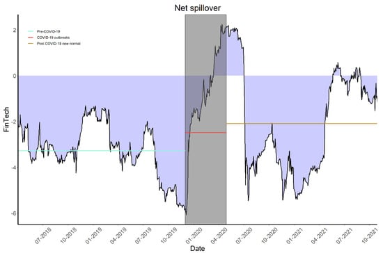 Second, a time-varying characteristic is clearly shown in Figure 6. Specifically, during the pre-pandemic period, the net spillover of the TFI on FinTech exhibits an upward trend. As a result, the NSI has decreased since 2018 and reached the lowest point by the end of 2019. Similar findings were also observed by Chen et al. (2020) [104]: that internet finance was a volatility spillover receiver in the early stage because of the unmatured market. The source of volatility spillover lies mainly in the security and diversified financials. The security industry in China has actively engaged in digitization: the whole industry invested 55 billion RMB in technology innovation from 2017 to 2019, the data of which were sourced from the Securities Association of China. The diversified business items in diversified financials may also link closely with FinTech. Interestingly, the NSI of FinTech increased rapidly during the outbreak period of COVID-19 and even became a net volatility spillover exporter. We assume two possible reasons for this phenomenon. On the one hand, the stock market experienced a great fluctuation during this period, which is explicitly shown in Figure 2 and is expected to enhance the overall spillover. On the other hand, FinTech innovations, such as mobile payment and digital banking, played important roles in supporting wide-reaching policy promptly and without physical contact, which challenged the dominant TFI to some extent [105]. During the post-COVID-19 period, the NSI of FinTech reached the level of the pre-COVID-19 period, which can be explained by the rigorous measures that the Chinese government has taken to fight against the COVID-19 epidemic. We can also observe some pluses of NSI during this period. We assume that these pluses could be due to the resurgence of COVID-19. For example, the NSI of FinTech increased from April 2021 to June 2021, and meanwhile, the COVID-19 pandemic has undergone twists and turns in some provinces in China, such as Anhui and Liaoning. Hence, further investigation is required to confirm this assumption.