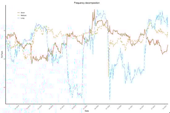 Figure 7 shows the rich time–frequency dynamics of spillover. One interesting observation from Figure 7 is that the fluctuations of spillover are mostly driven by low-frequency components (long-term spillover) when encountering shocks, whereas the contributions of short and medium term are relatively stable. It can be inferred that shocks fundamentally change the expectations of investors and create uncertainty in the long term. For example, the outbreak of COVID-19 from December 2019 to April 2020, the post-COVID-19 from April 2020 to July 2020, and the resurgence of COVID-19 from April 2021 to June 2021 experienced a fast increase (decrease) of long-term decomposed NSI of FinTech. The stabilization of short- and medium-term NSI can be attributed in part to the comparatively narrow frequency band and low information processing efficiency in China’s stock market [107].