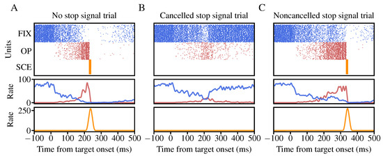 - Pare, M.; Hanes, D. Controlled Movement Processing: Superior Colliculus Activity Associated with Countermanded Saccades. J. Neurosci. 2003, 23, 6480–6489. [Google Scholar] [CrossRef] [PubMed]