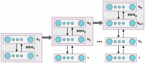 In the current research work, the HDBN approach is applied to detect cyberattacks. Based on the assumption that both DBN and DBM techniques have constraints, the current study presents the HDBN model that employs the Deep Boltzmann Machine system that contains two low-level layers of RBMs and the DBN technique that contains two-layer RBMs from the upper layers. Either the training time or model accuracy should be of concern [24]. The HDBN technique contains four layers. represents the visual state and it also acts as the input for the method. All the samples are defined by a set length vector. , and correspond to four hidden layers (HLs) with distinct counts of nodes for all the levels. The nodes with similar HL values cannot be linked together; for nodes of distinct layers, among , , and , there exists directed connections. Among HL , , and HL , there exists undirected FC. Next, the sample is signified as a set vector and is trained by the first two layers, i.e., and of DBM training. Here, stands for DBM outcomes. Simultaneously, implies the input of the DBN technique that is composed of and . Here, represents the last outcome of the HDBN approach. Related to the visual state, it is called higher-level semantic representation. Figure 3 illustrates the architecture of DBN.