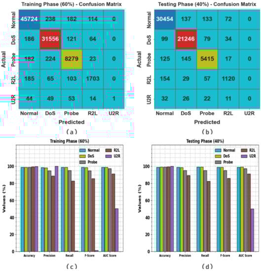 Figure 4 shows the classification outcomes of the HBA-OHDBN algorithm under the test dataset. Figure 4a,b portray the confusion matrices generated by the HBA-OHDBN method on 60:40 of the TR set/TS set. The outcome values demonstrate that the HBA-OHDBN approach classified and detected all five classes accurately. Figure 4c,d depict the classifier outcomes of the HBA-OHDBN methodology on 60:40 of the TR set/TS set. The proposed method accomplished effective detection of all four kinds of attacks and normal instances.