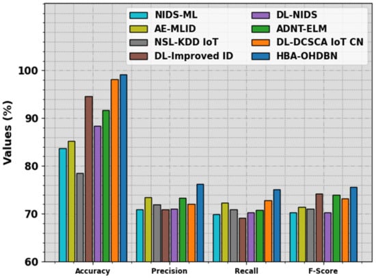 In Table 3 and Figure 10, the results of the comparative analysis between the proposed HBA-OHDBN technique and other existing models are provided [28]. The results indicate that the HBA-OHDBN technique achieved improved performance over other models. At the same time, the NSL-KDD IoT model achieved the worst results, while the NIDS-ML, AE-MLID, DL-NIDS, and ADNT-ELM models obtained closer results. Although the remaining models achieved reasonable outcomes, the HBA-OHDBN technique outperformed the rest of the models.
