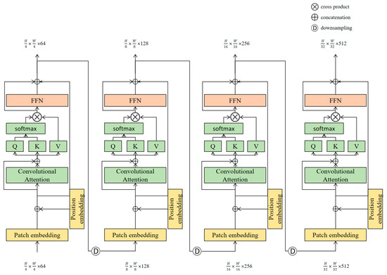 where ,, and are the matrices for query, key, and value, respectively, obtained through convolution; “” represents the attention matrix; “” denotes the original input; and “” is the final feature obtained.