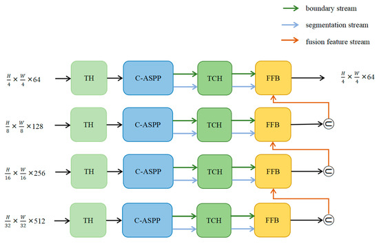 Figure 5 shows the CFAF module structure, encompassing the four feature analyses and fusion units. Each unit comprises the following four components: a transformer head (TH), cross-modal atrous spatial pyramid pooling module (C-ASPP) [20], transformer conversion head (TCH) [20], and feature fusion block (FFB). Given that the MCA progressively integrates and independently outputs features from each receptive field, features from different levels might exhibit discrepancies, as highlighted in references [42,43]. Directly processing these features could potentially limit the model’s performance. To address this, a TH was designed to consolidate these features and mitigate the impact of such discrepancies on the model’s efficacy [34,35]. This design aimed to enhance the model’s performance by effectively integrating and leveraging features at different levels. C-ASPP performed cross-modal bifurcation of the features into boundary and segmentation features. TCH, equipped with two THs, further weighs and analyzes the boundary and segmentation features. FFB fuses features of the boundary, segmentation, and preceding layer. It weighs and analyzes the fused features again. CFAF accepts four features from the MCA output with dimensions (, , 64), (, , 128), (, , 256), and (, , 512). Consequently, it outputs a feature of size (, , 64), which is fed into the classification convolution layer for categorization and up-sampling to obtain the final detection image result.