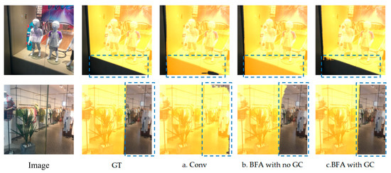 Herein, the effectiveness of BFA and its GC module is validated. The experiments were divided into the following three groups: (a) convolutional approach, (b) BFA without the GC module, and (c) BFA with the GC module.