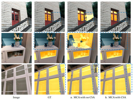 Figure 10 shows that in the qualitative experiments without using CSA, the model detected the glass position; however, it struggled to fully distinguish between the target and non-target areas. After incorporating CSA, the model detected the glass region (row 3) more comprehensively and distinguished between the target and non-target areas (blue dashed box in Figure 9) more precisely.