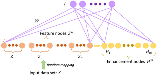 where and are randomly produced with appropriate dimensions. Moreover, is further fine-tuned by applying the sparse autoencoder technique [6,38]. Chen et al. indicated that utilizing a sparse autoencoder can slightly fine-tune the generated features and obtain more useful features for evaluation [6]. In the proposed model, we also follow the same strategy from the standard BLS to acquire the desired features. In this way, all produced feature nodes can be expressed as follows: