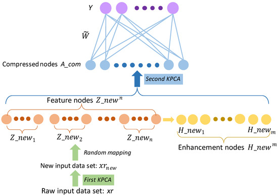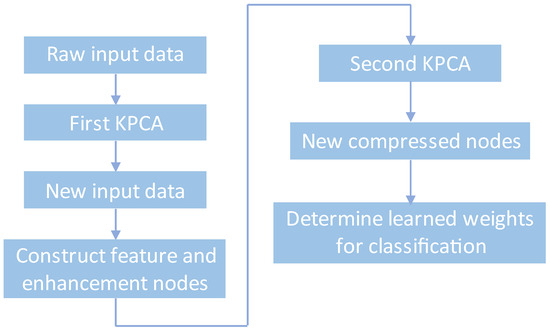 where denotes the compressed nodes, as expressed in Figure 3; Y indicates the label matrix; I signifies the identity matrix; and represents the regularization parameter. For the test procedures, test samples mapped with the first KPCA are processed and generated corresponding to the feature/enhancement nodes, which are further mapped and compressed with the second KPCA and applied to determine the predicted output matrix () with the learned weight matrix (). Thus, the final predicted class labels can be obtained using .