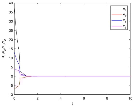 Therefore, all the conditions of Theorem 2 are satisfied, and we can further infer that global polynomially synchronization is achieved between the drive system and the response system. Furthermore, Figure 2 shows the evolution of synchronization errors , , , and with initial values , , , and . Obviously, it can be found that the error trajectories converge to a zero vector under feedback control in Figure 2.