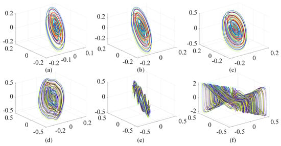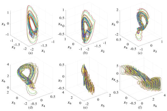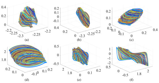 Sub-hyperchaotic attractor observed from system (4) with () = (, 3, 0.75, 2, , 2, −1, 1, −0.01, −3, 1, , , ): (a) phase plane; (b) phase plane; (c) phase plane; (d) phase plane; (e) phase plane; (f) phase plane.