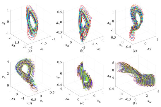 When () = (, 3, 0.945, 2, , 2, −1, 1, −0.01, −3, 1, , , ) and the initial conditions are (0.1, 0.1, 0.1, 0.1, 0.1, 0.1, 0.1, 0.1), system (4) exhibits a sub-hyperchaotic attractor in Figure 4, and the corresponding eight Lyapunov exponents are (0.25, 0, 0, −0.80, −0.96, −1.09, −1.36, −1.98).