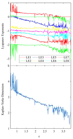 In the hyperchaotic region, which is defined as , the Kaplan–Yorke dimension falls within the approximate range of . However, for , the Kaplan–Yorke dimension is mostly found within the range of .