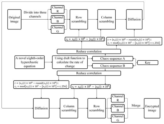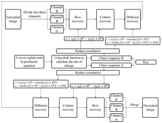 The encryption scheme uses two chaotic sequences generated by the novel eighth-order hyperchaotic system Equation (5) when and , which is used to enhance the security of images. The proposed scheme in this study involves row scrambling, column scrambling, and diffusing using chaotic sequence A (), as well as diffusing, column scrambling, and row scrambling using chaotic sequence B (). The encryption algorithm and decryption algorithm are shown in Algorithms 1 and 2.