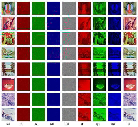 The following is an experimental analysis of the image encryption algorithm proposed in this paper. The experiment involves the use of eight color images, each consisting of 512 × 512 pixels, as depicted in Figure 8. The original images are shown in (a). The encrypted images are shown in (b)–(e), and the decrypted images are shown in (f)–(i).