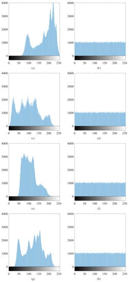 Comparison of the histograms of the original image and the encrypted image: (a,c,e,g) the histogram of the R, G, B, gray channel of the original image; (b,d,f,h) the histogram of the R, G, B, gray channel of the encrypted image.