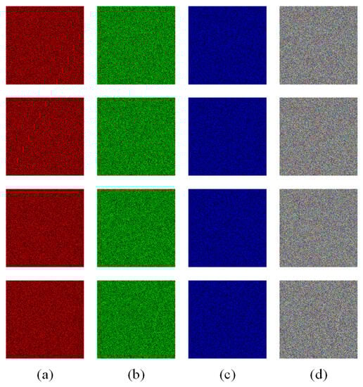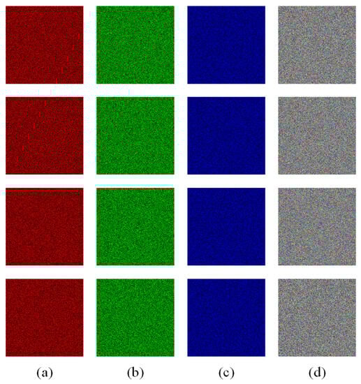 Differential attack test: (a) the difference between the twice encrypted image of the R channel of images; (b) the difference between the twice encrypted image of the G channel of images; (c) the difference between the twice encrypted image of the R channel of images; (d) the difference between the twice encrypted images of three channels of images.