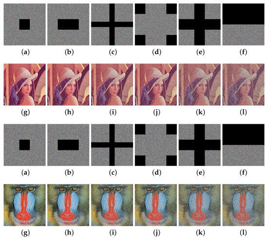 Cropping attack test [50]: (a) cropped 6.25% of the encrypted image; (b) cropped 12.5% of the encrypted image; (c) cropped 23.44% of the encrypted image; (d) cropped 25% of the encrypted image; (e) cropped 43.75% of the encrypted image; (f) cropped 50% of the encrypted image; (g) decrypted image based on the cropped 6.25% of the encrypted image; (h) decrypted image based on the cropped 12.5% of the encrypted image; (i) decrypted image based on the cropped 23.44% of the encrypted image; (j) decrypted image based on the cropped 25% of the encrypted image; (k) decrypted image based on the cropped 43.75% of the encrypted image; (l) decrypted image based on the cropped 50% of the encrypted image.