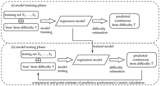 A flowchart of the regression task is in Figure 2; similarly, a classification task scheme is in Figure 3. Regardless of the regression or classification task, the predicted item difficulty values are compared to the ‘true’ ones as estimated using the Rasch model. To increase reproducibility as much as possible, algorithms are learned on training subsets, while point estimates of the predictive metrics are estimated on testing subsets. This is repeated several times to obtain a more robust estimate of the predictive performance, averaging all point estimates collected from individual iterations.