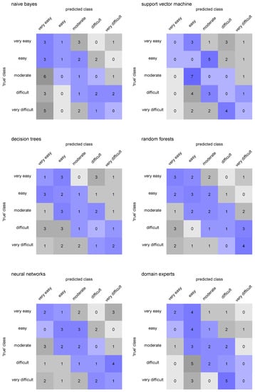 Domain experts estimate the item difficulty Y using their empirical knowledge in the field, and their item difficulty estimates Y might also be categorized to create . Thus, domain experts can be treated as “another” regression and “another” classification algorithm and their performance can be compared to the predictive and classification performance of ML algorithms. Many ML algorithms have both the regression and classification version [29], as we describe in more detail in the next section.