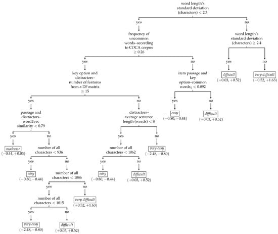Classification trees, also called decision trees, partition the dataset into subdatasets to contain ideally observations of only one class of item difficulty Y. The partitioning is performed successively from the original dataset by binary splitting; a given criterion is minimized within each dataset splitting. In other words, item features’ universe is split into disjunctive orthogonal subspaces, including, if not all, then the vast majority of all points from one class of item difficulty Y. Each step of the dataset partitioning, i.e., splitting a parenting dataset into two new child subdatasets, enables the growth of a typical tree plot, dendrogram, by adding two new child branches; see Figure 6. The partitioning is applied multiple times until the dataset is split according to item difficulty Y classes’ distribution [38].