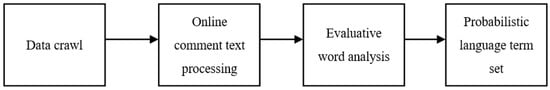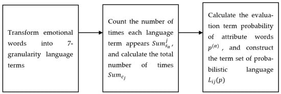 After the hotel reviews are preprocessed, the data are described and counted using probabilistic language term sets (PLTSs). After data crawling, the attributes in the q review data of each hotel are transformed with language terms, and all attributes and the frequency of language terms are counted. This is represented by a probabilistic language term set, which is divided into the following three steps, as shown in Figure 3: