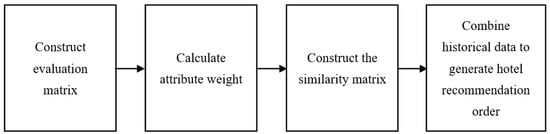 In this paper, the set will be employed to represent the set of hotels, while the set will represent the hotel attributes that users consider when referencing other users’ review information during the hotel selection process. A large number of online review texts are processed based on the probabilistic language term set, and after obtaining useful information, the system will recommend multiple hotels according to the historical data of hotel selection by tourists. The specific idea is shown in Figure 1.