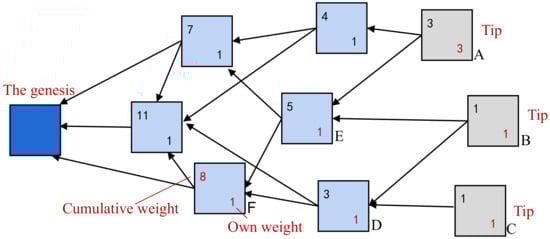 As a distributed ledger of IOTA, the tangle has multiple attributes [10]. Weight is one of the most important in the tangle, which can measure the importance degree of transactions. In IOTA, weight is divided into cumulative weight and own weight. The larger the cumulative weight of a transaction in the tangle, the more significant it is. A transaction’s own weight is directly proportional to the workload of issuing the transaction node. The tangle structure is shown in Figure 1. The left-most transaction is the Genesis transaction, and the right-most unapproved transactions are called tips, such as A, B, and C. The numbers on each transaction represent the weight; the upper left corner represents the cumulative weight, and the lower right corner represents own weight. Since IOTA adopts a ternary structure, a transaction’s weight is expressed by the power of 3. Assuming that the own weight of each transaction is 1, it can be deduced that the cumulative weight of a transaction is equal to the total number of nodes directly or indirectly approving the transaction plus 1.