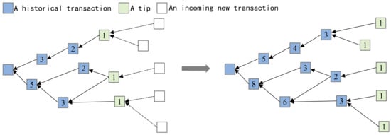Figure 3 shows an instance of the cumulative weight of a transaction changing over time, with numbers only representing the cumulative weight of the transaction. The blue pattern block, green pattern block, and white block have the same meaning as Figure 2. To simplify the calculation, assume that the own weights of the transactions are all 1. When five new incoming transactions are successfully attached to the tangle, the cumulative weight of each directly or indirectly approved transaction will increase accordingly, as shown on the right side of Figure 3.