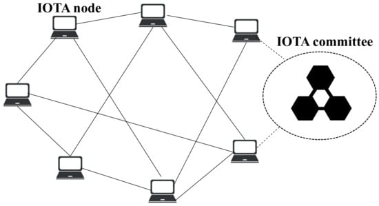 The IOTA system is mainly composed of four entities, namely IoT devices, clients, IOTA nodes, and the IOTA committee, as shown in Figure 6 (Generally, due to the limited computing power of the client, the tip selection and calculating PoW difficulty are mainly performed by the client with the help of IOTA nodes). In the IOTA system architecture, the four types of entities have a clear division of labor and cooperate with each other to jointly generate the tangle and broadcast it to the entire network through P2P protocols to complete the consensus process [23]. Among them, the IOTA committee must not only be responsible for the daily management and maintenance of the IOTA system, but also ensure that the system clock is not tampered with to prevent some nodes from cheating due to unauthorized changes in the time of issuing transactions.