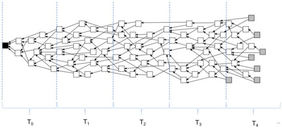 - Starting from the generation of the Genesis transaction, the time is gradually divided into slots (such as equal-length slots). The tangle will experience gradual growth in each time slot, represented by for each time slot. Due to the time required for network transmission and packaging transactions, we selected ten-times the estimated time for initial approval as the length of a time slot. That is, , the length of , is (). The tangle that grows over time is shown in Figure 8.