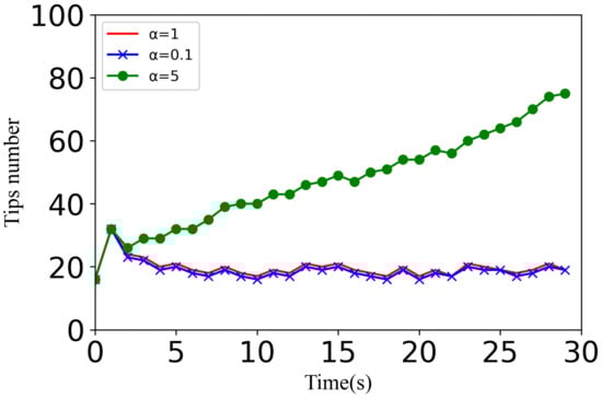 - The result of tip selection depends on . In Figure 11, the number of tips remains stable when . This indicates the smaller the value, the more random the tip selection result is. When , the number of tips remains stable around a single value. The impact of is not significant. When , the number of tips increases with . This shows that the higher the value, the more inclined the tip selection is towards transactions with a large cumulative weight. This results in transactions with a small cumulative weight not being approved on time.