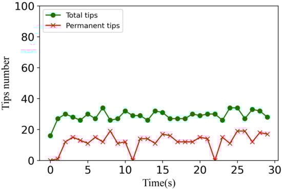 - In the next time slot, the unapproved tips will be prioritized first. Thus, the survival of unapproved tips (also known as permanent tips) will not exceed two time slots. Figure 12 shows the trend of the permanent tips’ number per time slot. However, there are still a certain number of unapproved tips within each time slot in Figure 12; this indicates that some permanent tips have not been completely eliminated.