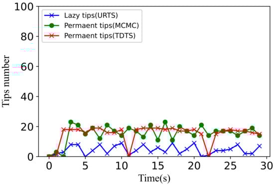- In Figure 10, it can be seen that some permanent tips have been generated, and the number slightly fluctuated over time, but did not increase significantly. This indicates that some tips detained in the tangle have been discarded due to long waiting times. MCMC cannot prevent the generation of permanent tips and does not take punitive measures.