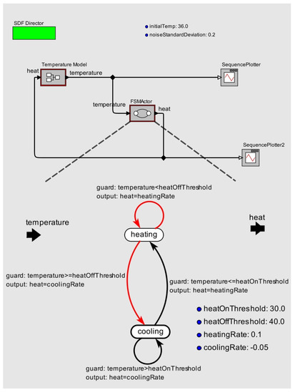 Ptolemy II, as an open-source modeling and simulation tool, stands out from other modeling tools by offering support for hierarchical modeling of heterogeneous systems. As a result, Ptolemy II serves as a suitable modeling environment for designing uncertain CPS. In this study, Ptolemy II is utilized to model a CPS thermostat with uncertainty and failure, as depicted in Figure 5. In the heating state of the Finite State Machine (FSM), both outgoing transitions become feasible when their execution conditions (i.e., both being true) are satisfied. The two uncertain transitions are highlighted in red.