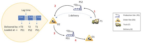 Dynamic RMC is a scheduling problem similar to pick up and delivery problems (PDPs) [8,9]. It considers a set of orders that must be fulfilled by delivering concrete from several production sites (PSs) to order sites (OSs) using a fleet of concrete delivery trucks. One delivery refers to a round trip of a truck (Figure 1); it gets loaded at PS, travels to OS for unloading the delivery, and travels back to a PS to get washed and loaded again.