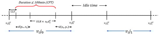 Partial schedule of truck with two delivery jobs. represents the travel time from the location of x to the location of y. For job , the truck consumes time for (1) CLT, (2) travel from to , (3) unloading, and (4) travel from to another PS.