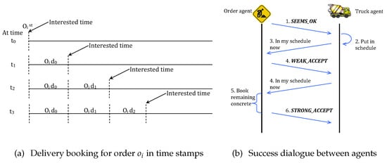 (a) Delivery booking by changing interested time. For instance, at , and are booked, and the interested time is announced to obtain proposals for . (b) A typical dialogue between an order agent and truck agent, where delivery status gradually evolves from to .