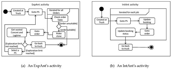 Figure 4. (a,b) After EXPLORATION_INTERVAL and INTENTION_INTERVAL, ExpAnt and IntAnt are created at the truck and follow respective activities.