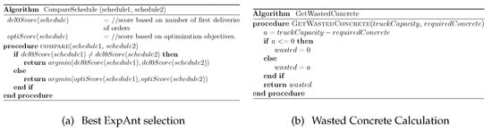 Figure 5. (a) Heuristic used by a truck agent to select the ExpAnt with the best schedule. (b) The procedure used by the order agent when an ExpAnt enquires about wasted concrete. - Step 3: