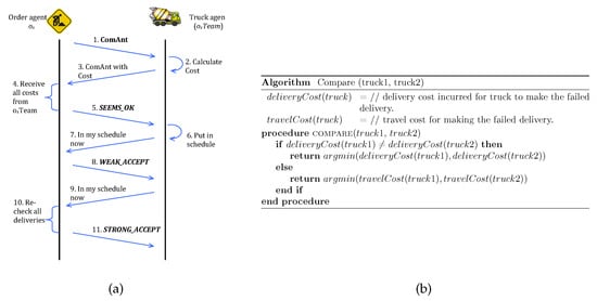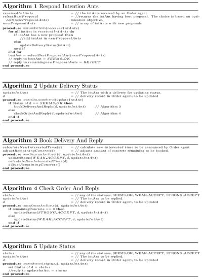 The truck agent periodically sends both types of ants. The order agent and the truck agent maintain the status of the delivery bookings. The algorithm the order agent uses to respond to IntAnts is shown in Figure 6. Suppose order agent receives proposals from truck agents and but selects the proposal of . Order agent replies to the corresponding IntAnt of with a message of (Figure 6, Algorithm 2). For the IntAnts of and , replies with a message (Figure 6, Algorithm 1).