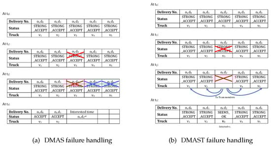 Change in order plan order when one of ’s delivery -- failed at . (a) In DMAS, starts to re-plan all future deliveries after by adjusting its interested time. (b) In DMAST, seeks help from the team members.