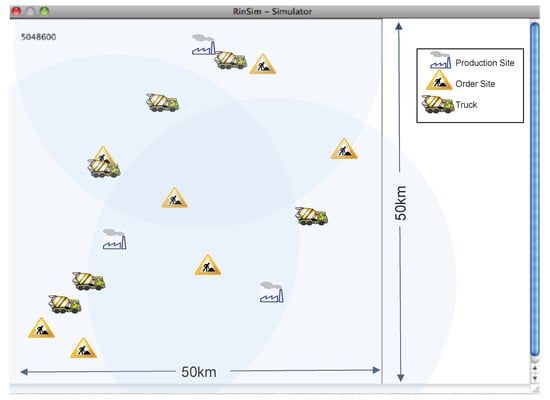 - Lon, R.R.v.; Holvoet, T. RinSim: A simulator for collective adaptive systems in transportation and logistics. In Proceedings of the 2012 IEEE Sixth International Conference on Self-Adaptive and Self-Organizing Systems, Lyon, France, 10–14 September 2012; pp. 231–232. [Google Scholar]