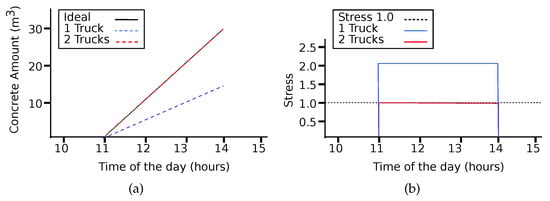 Further dialogue between the truck agent and the order agent, as shown in Figure 3b, is explained subsequently in this section. After scheduling delivery at , if more concrete is required, will announce a new interested time and wait for truck proposals (Figure 3a). Thus, the order agent continues to schedule its deliveries until the truck agents book all the required concrete.