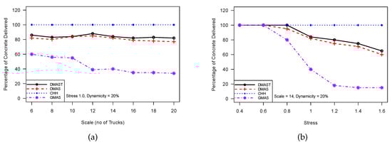 The non-functional requirements include the following: (1) Consistent performance with increasing stress and scale; stress refers to the amount of concrete required to be delivered by a specific number of trucks, while scale defines the size of the problem (details in Section 4.1). (2) Adaptive schedule in a dynamic environment; dynamism is caused by orders arriving dynamically and truck breakdowns at any time during the day. These breakdowns result in delivery failure. Despite dynamic events, we want to avoid unnecessary changes in the truck schedules (details in Section 4.1). (3) Maximising the number of fully served orders; when a truck fails to deliver, other trucks should gracefully handle the failed delivery.