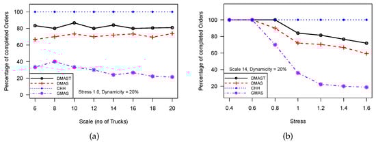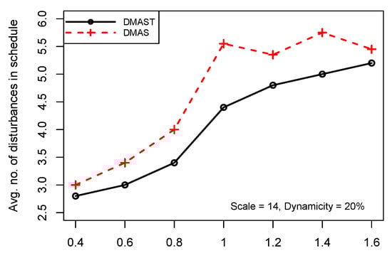 The other area in which we notice DMAST outperforming DMAS is the number of disturbances while scheduling (Figure 17). Since DMAST tends to find the failed delivery within a team, other trucks’ schedules’ are less disturbed, as they do not receive a message for already existing bookings. Consequently, using DMAST, we have up to 20% more stable and reliable schedules than DMAS.